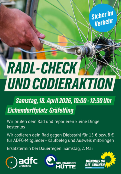 Als Vorbereitung für die anstehende Radlsaison werden wir von den Grünen Gräfelfing gemeinsam mit der Schrauberhütte Planegg und dem ADFC Gräfelfing am 18.04. von 10 Uhr bis 12:30 Uhr auf…